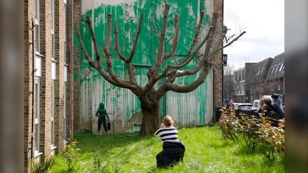 The art work within the Finsbury Park neighborhood covers the wall of a four-story residential constructing and exhibits a small determine holding a strain hose beside a big cherry tree. Inexperienced paint has been sprayed throughout the wall, replicating the absent leaves of the tree, which has been severely pruned in a way referred to as pollarding.